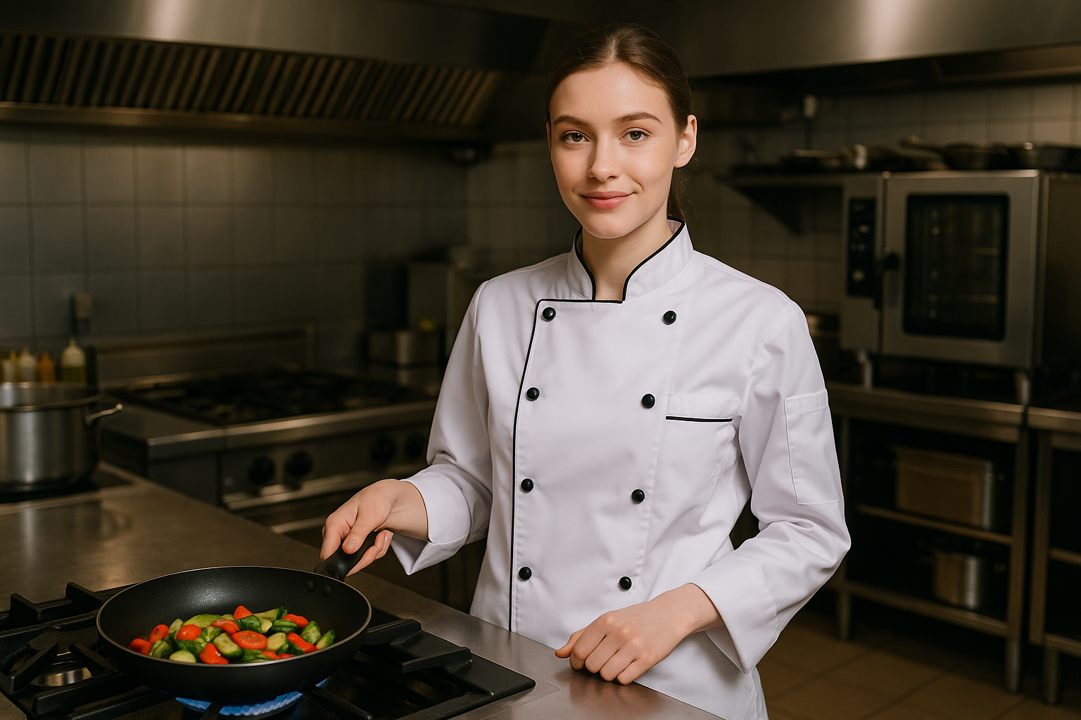 A clean, everyday chef jacket designed for busy kitchens. The cross-over front with front buttons and an open mandarin collar keeps the look sharp, while reversible cuffs and a right-sleeve pocket add daily practicality. Durable, easy-care.